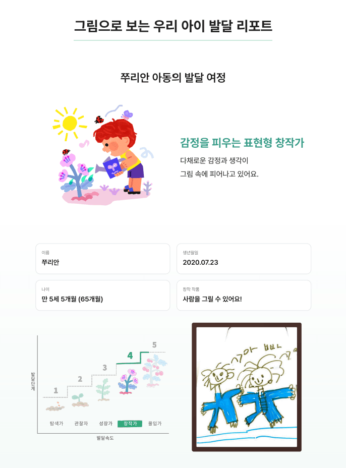 아이의 그림을 바탕으로 발달 단계에 맞는 표현 유형을 일러스트로 보여주고, 발달단계를 한눈에 볼 수 있게 합니다.