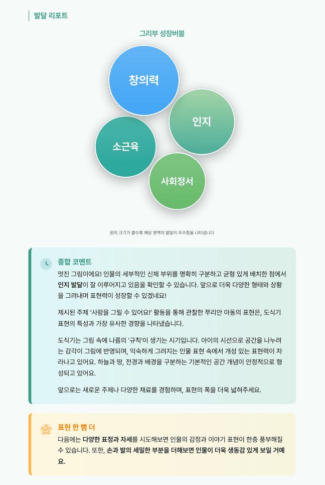 그림 한 장이 아이의 발달을 말해줍니다. 지금 바로 무료로 체험해보세요.