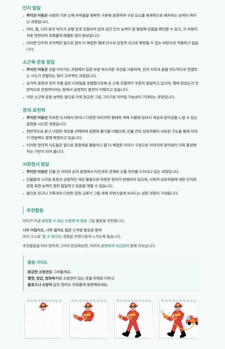 각 영역별로 관찰되는 특징과 의미를 정리해 발달 상태를 이해할 수 있도록 돕고, 그림 표현을 확장할 수 있는 추천 활동을 제공합니다.